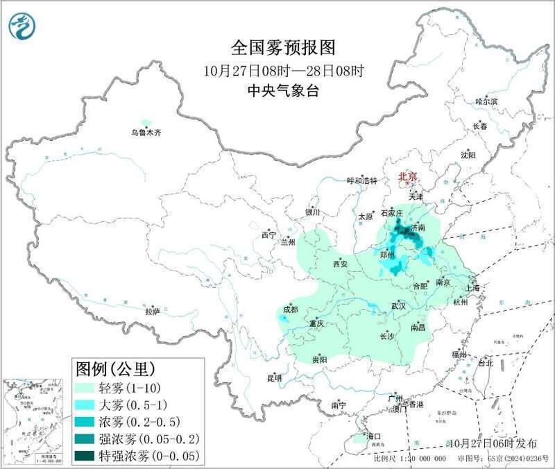 27日朝晨至上昼,河北南部、河南中北部、山东西南部、安徽北部、江苏西北部等地的部分地区有大雾天气,局地有能见度不及200米的强浓雾。此外,27日至29日,华北中南部大气扩散条款渐渐转差,部分地区有轻度霾,局地中度霾天气。