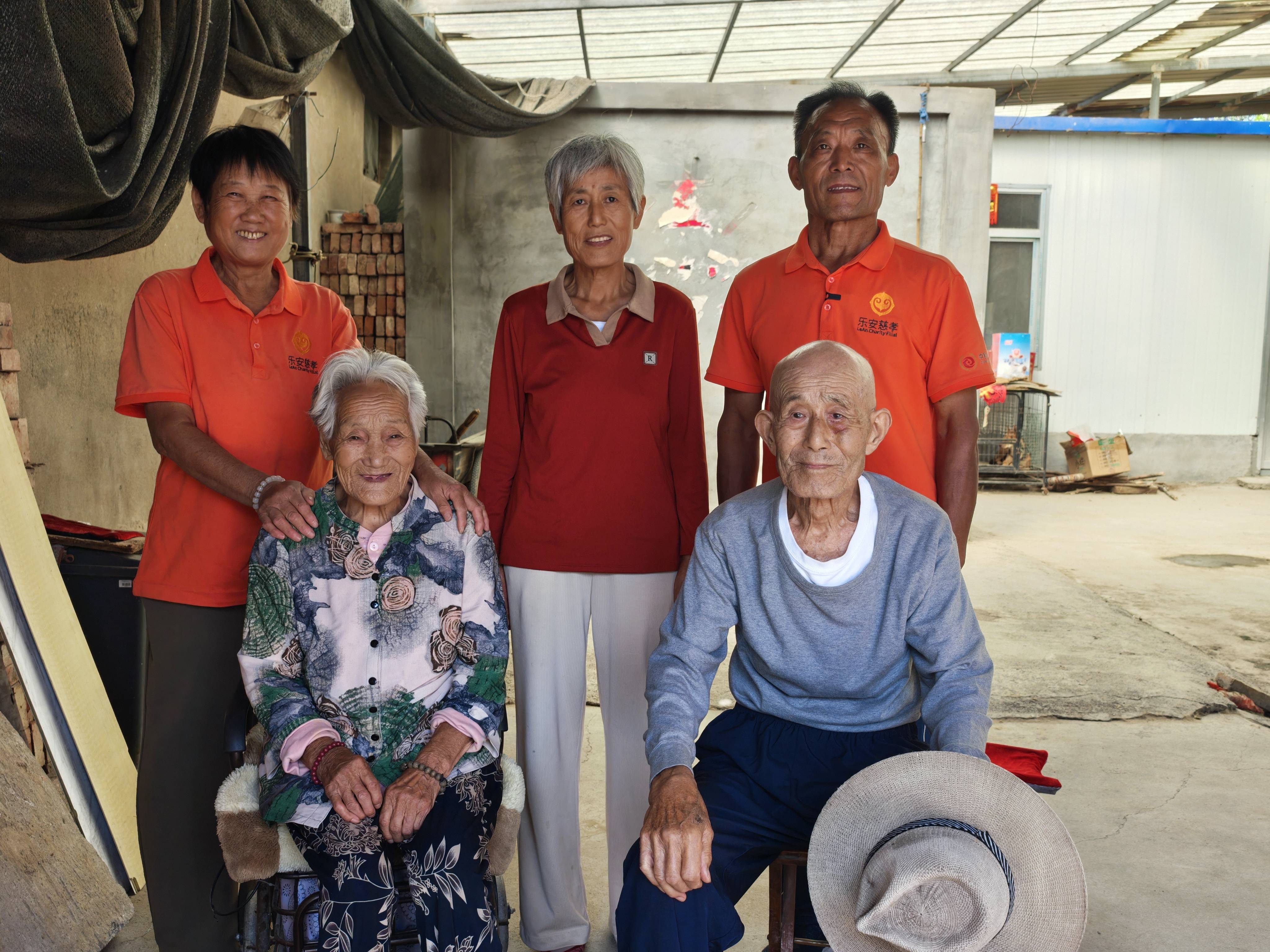 当地“轻老”照管员与被照管的老东说念主合影。新华社记者 李傲秋 摄